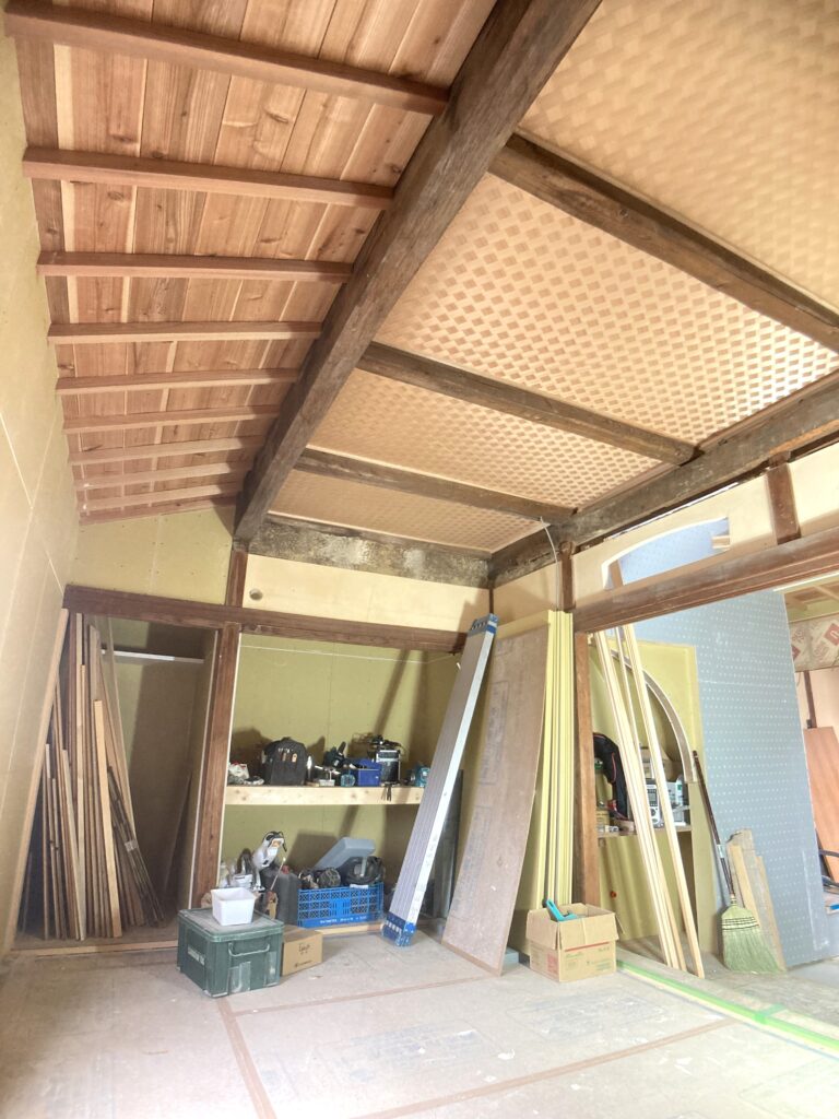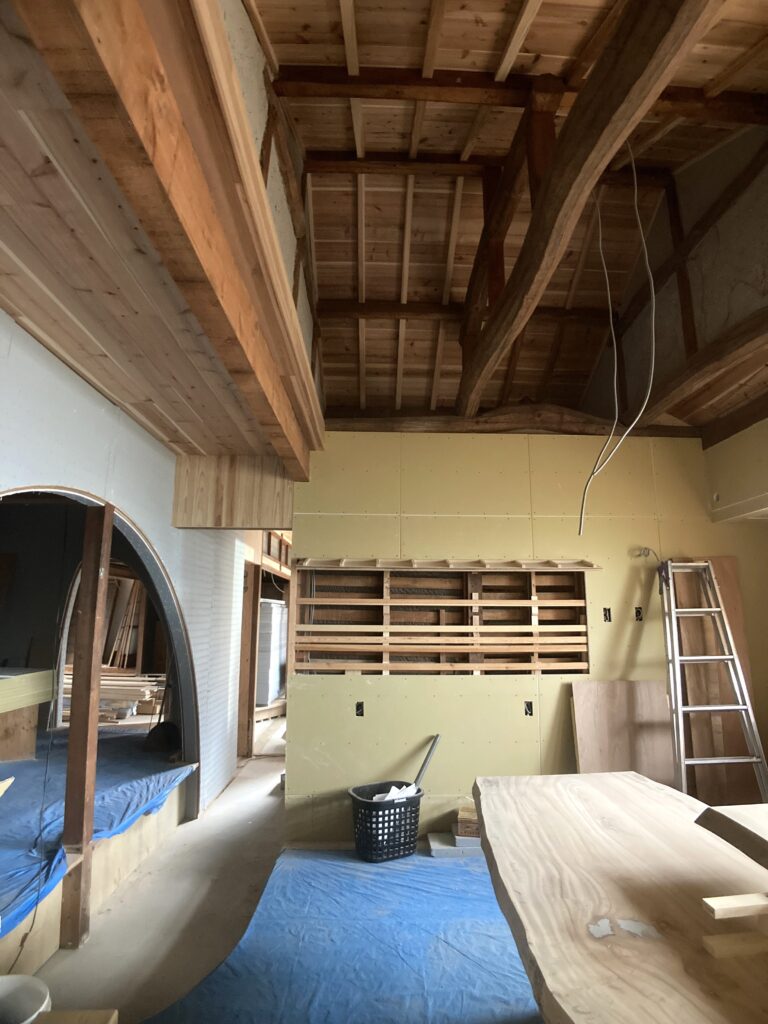 リノベーションの現場。天井に網代を張りました。元々の漆喰壁や梁と馴染んで、和を感じるモダンな空間に。