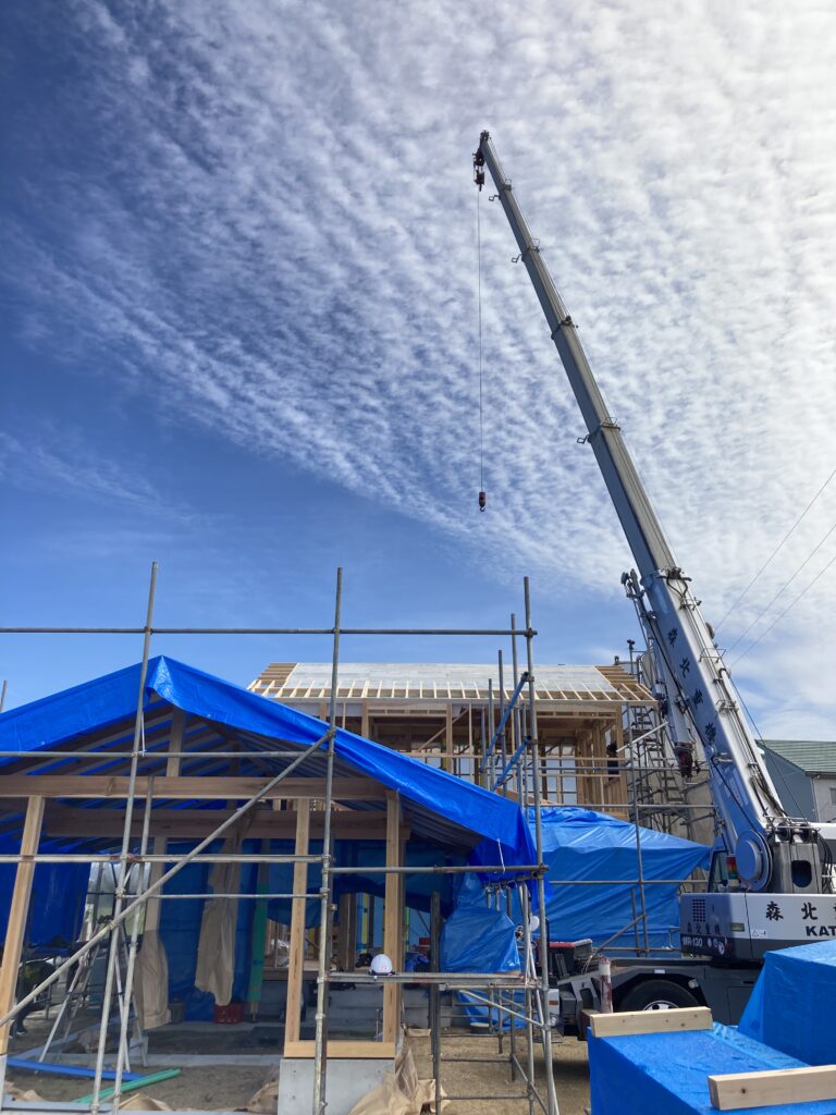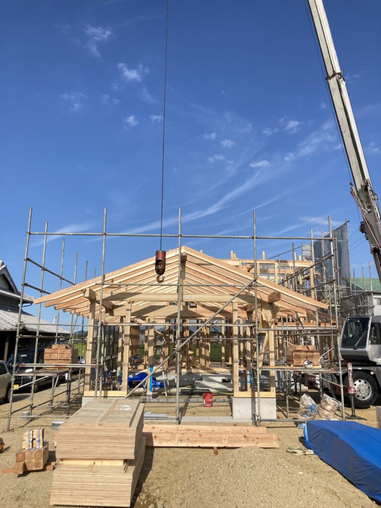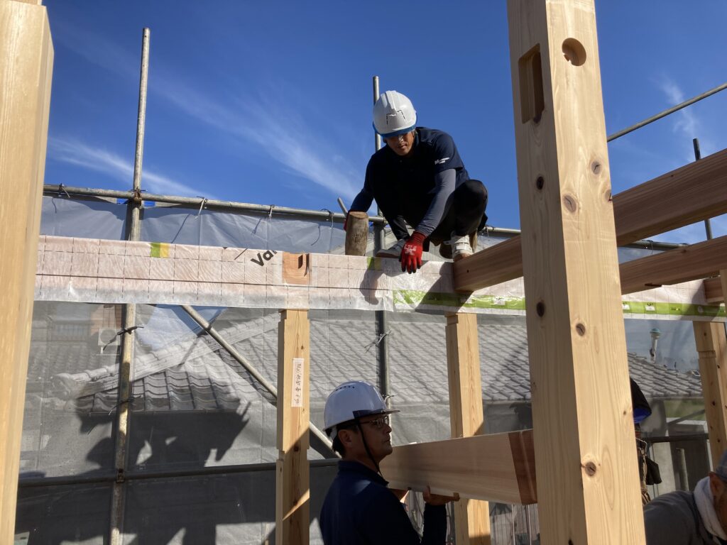 大工さんたちが連携して、柱や梁などの構造体を組み上げていきます。