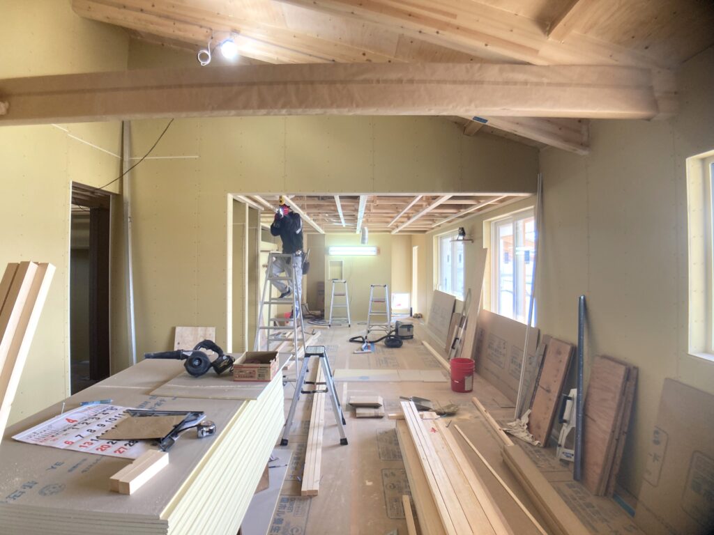 室内では、大工さんが天井の下地ボードを張ってくれています。